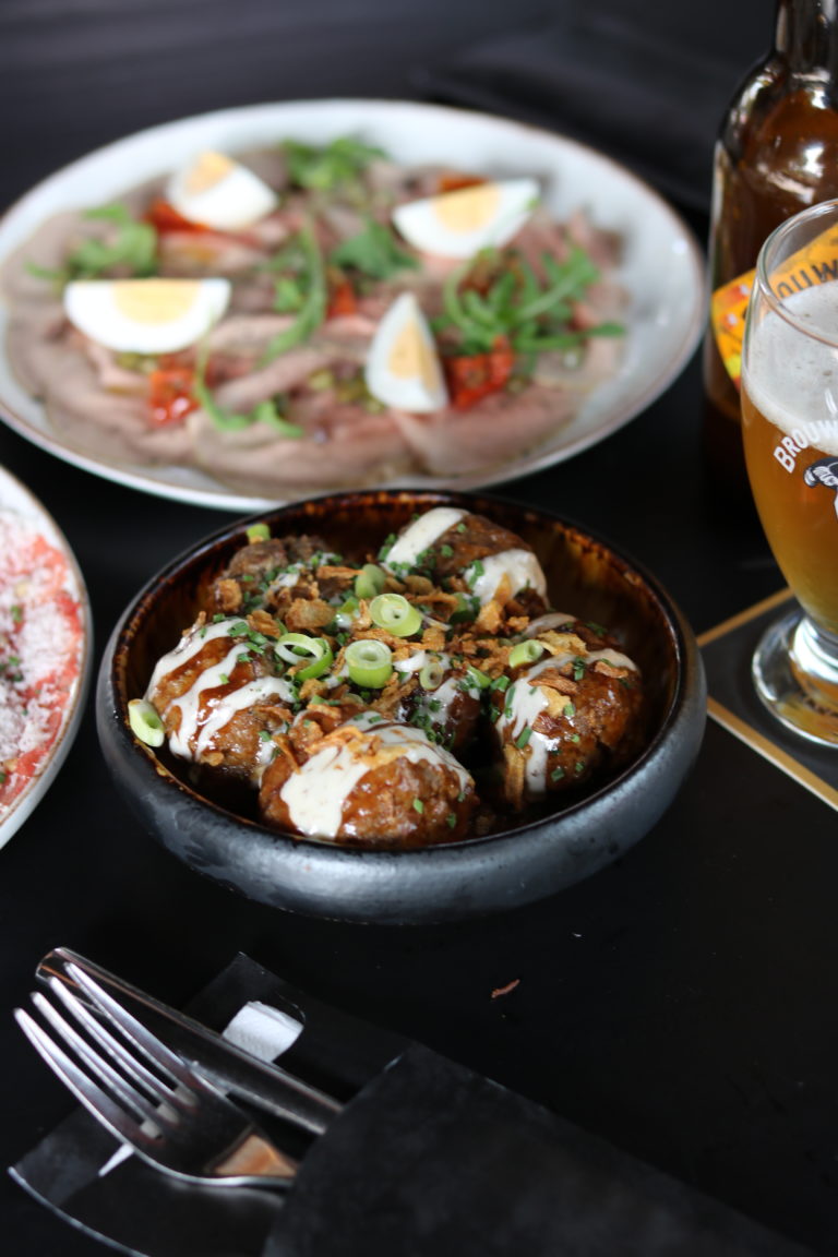 dungesneden ossenhaas, truffelmayo, rucola, Parmezaanse kaas, spekjes, zonnebloempitten & een gebakken ei